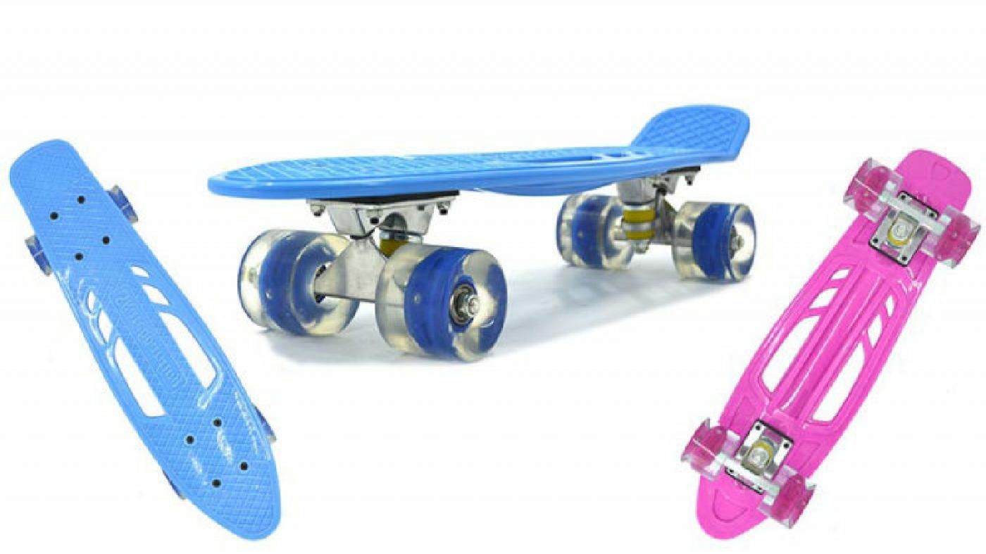 Чтобы скейт был не только красивым, но и удобным, на поверхности антискользящей платформы данной модели есть специальные ручки для переноски. А за привлечение внимание прохожих отвечают подсвечиваемые колеса, выполненные из очень прочного и долговечного материала.