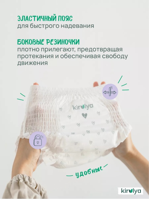 Мягкость и удобство: УЛЬТРАТОНКИЕ! Внутренний слой "Kirulya" создан для нежного контакта с кожей вашего малыша. Мы также предусмотрели эластичные пояса для быстрого надевания и боковые резиночки, которые плотно прилегают, предотвращая протекания и обеспечивая свободу движения детям.