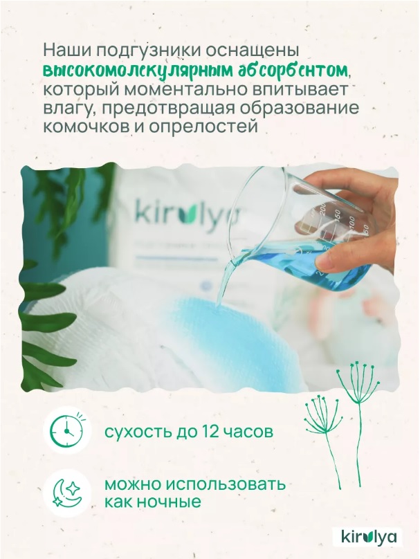 Мягкость и удобство: УЛЬТРАТОНКИЕ! Внутренний слой "Kirulya" создан для нежного контакта с кожей вашего малыша. Мы также предусмотрели эластичные пояса для быстрого надевания и боковые резиночки, которые плотно прилегают, предотвращая протекания и обеспечивая свободу движения детям.