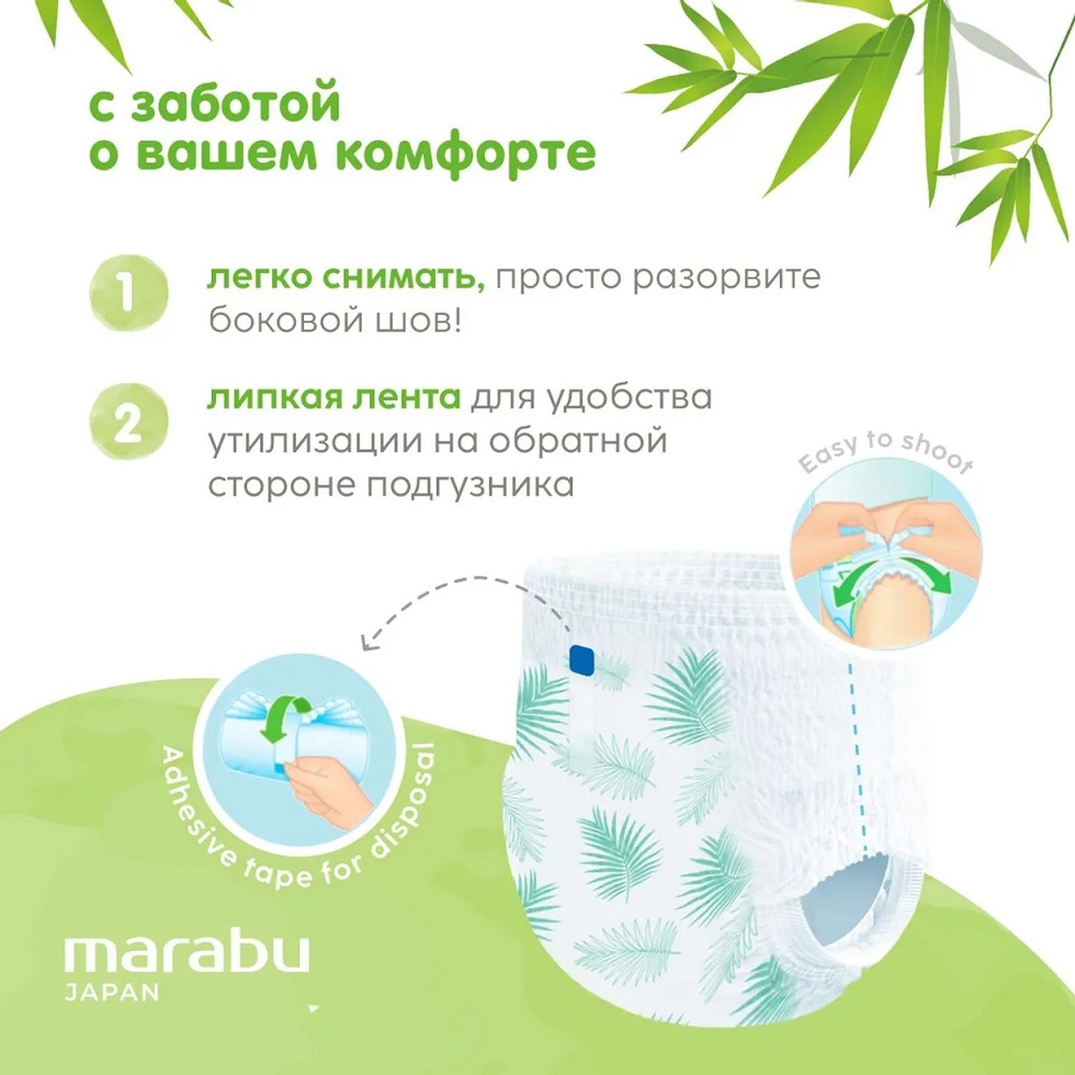 Натуральный состав: Подгузники трусики разработаны в соответствии с экологическими стандартами качества, не содержат латекса, отдушек и спирта. В составе присутствуют бамбуковые волокна, которые обладают природными свойствами для защиты от бактерий и неприятного запаха.