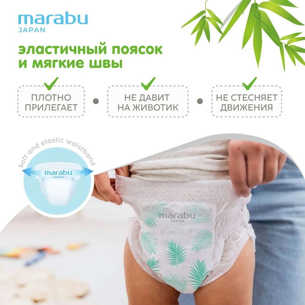 Натуральный состав: Подгузники трусики разработаны в соответствии с экологическими стандартами качества, не содержат латекса, отдушек и спирта. В составе присутствуют бамбуковые волокна, которые обладают природными свойствами для защиты от бактерий и неприятного запаха.