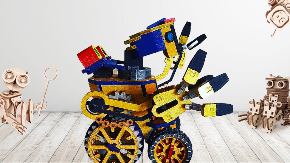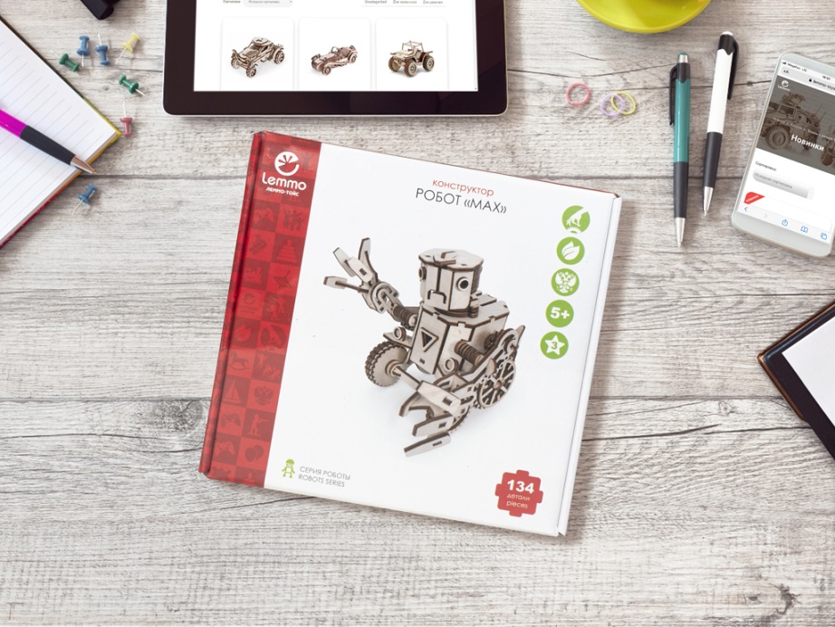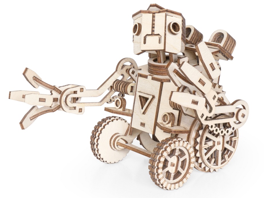 Особенности: все детали выполнены из качественной древесины и имеют сильный насыщенный запах дерева. Робота после сборки можно раскрасить акриловыми и гуашевыми красками, но даже без этого в результате получается полноценная красивая игрушка с подвижными элементами.