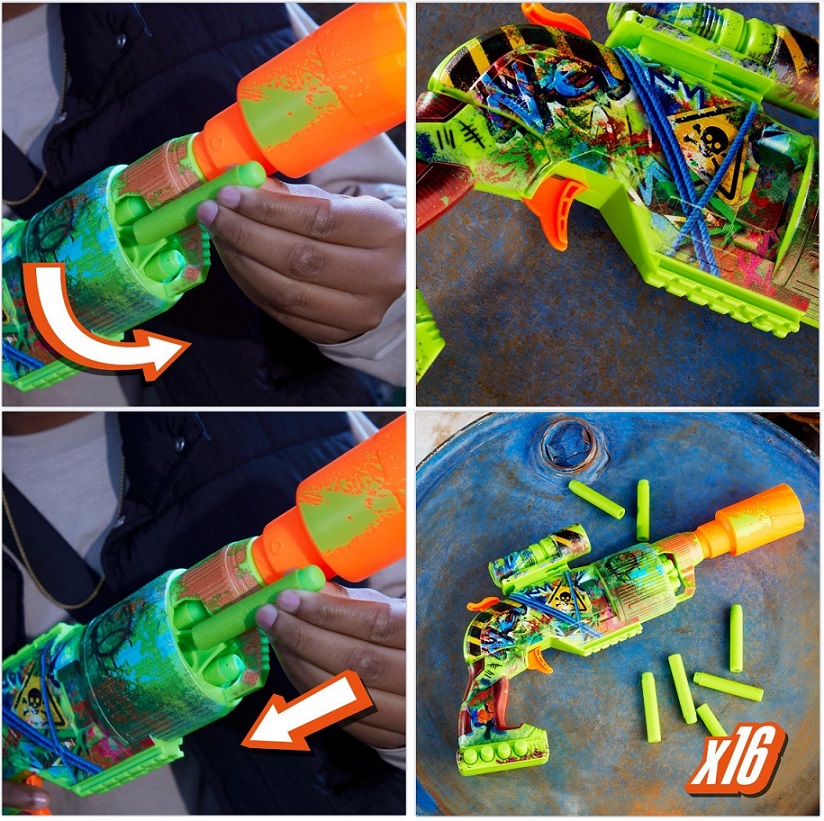 Бластер Nerf Zombie Driller полностью украшен яркими, привлекающими внимание граффити-рисунками с обеих сторон. Дизайн бластера создает вид боевого снаряжения, которое могли бы использовать зомби-бойцы в мире, захваченном мерзкой нежитью.