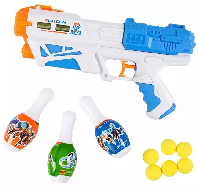 - Пистолет-бластер 2в1 с шарами + стреляет водой + 3 мишени кегли 648-30
