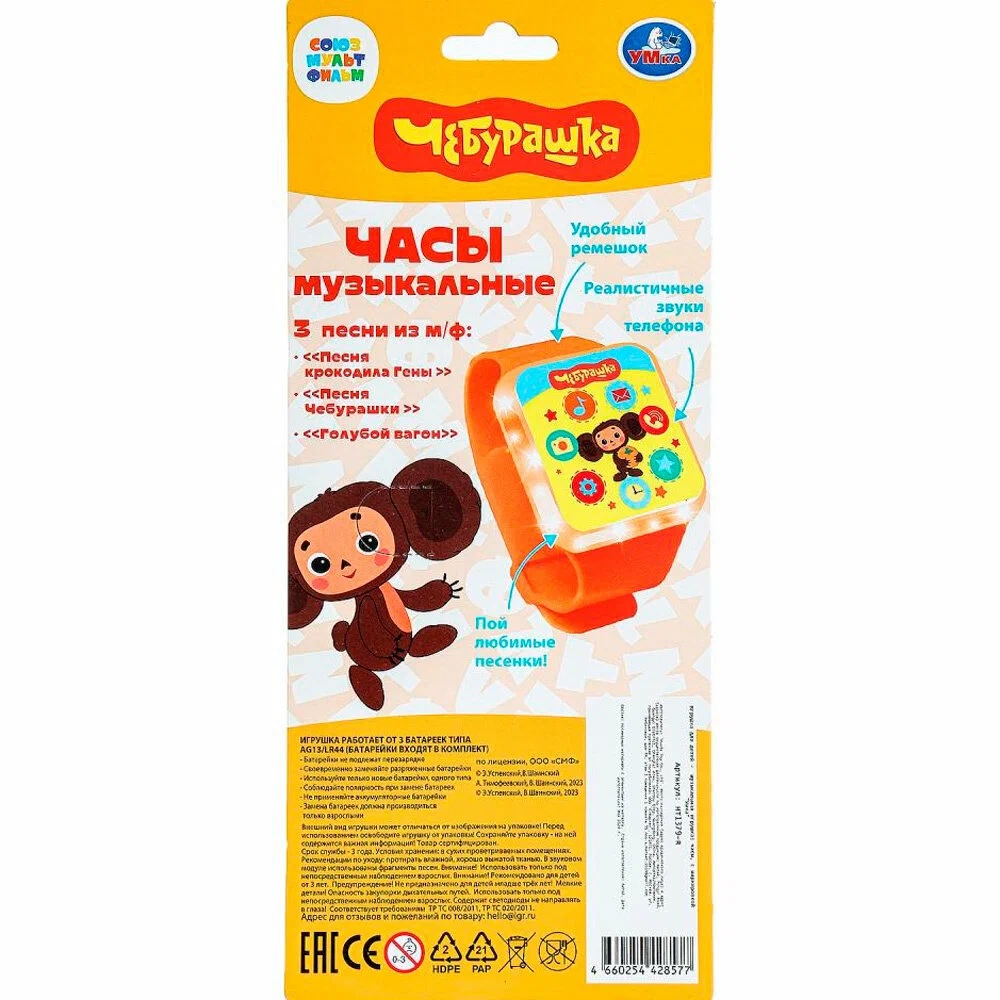 Музыкальные часы «Чебурашка» ТМ «УМка» станут прекрасным подарком для маленьких поклонников мультфильма про забавного ушастика.