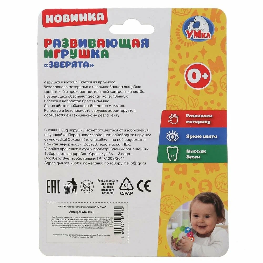 Прорезыватель "Зверята" Умка WD3345-R - это не просто игрушка, это развивающий инструмент, который поможет вашему ребенку расти и развиваться с раннего возраста.