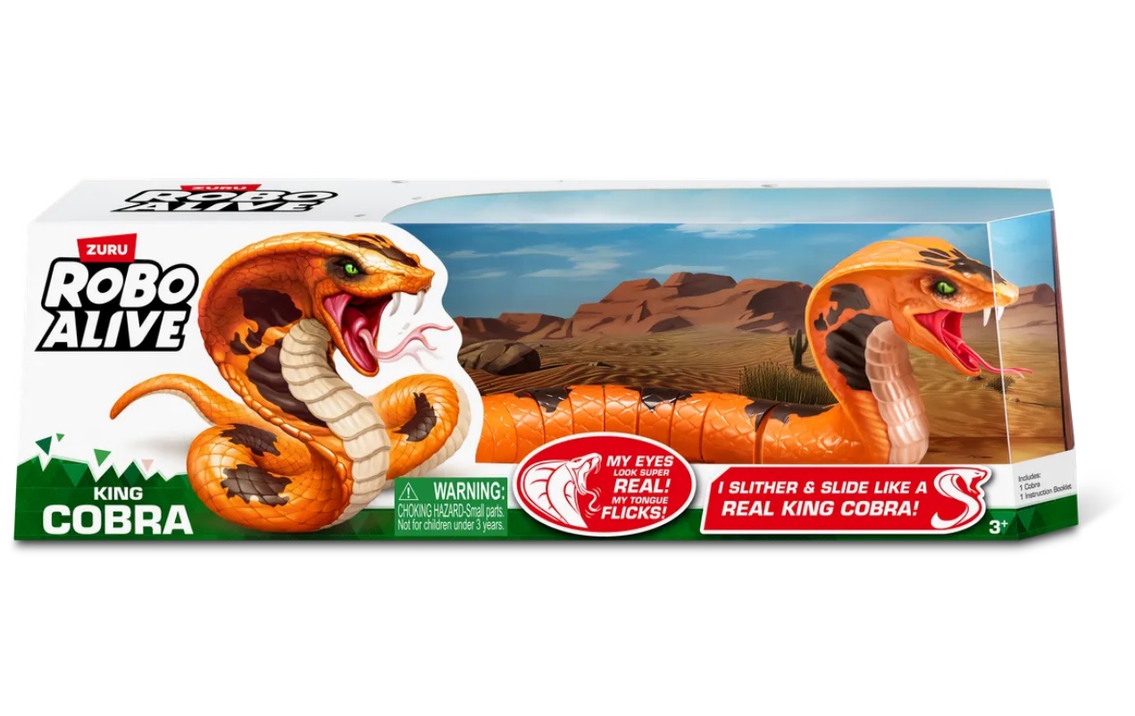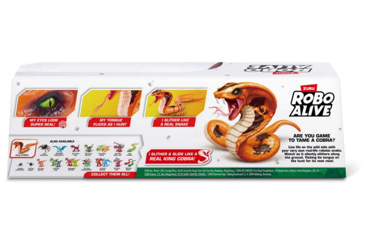 Дайте волю острым ощущениям с робо-коброй Robo Alive King Cobra от ZURU! Эта интерактивная игрушка создана для захватывающих игр и розыгрышей. Реалистичная ползущая змея длиной 44,5 см щёлкает языком и скользит по полу в поисках добычи, создавая эффект полного погружения.