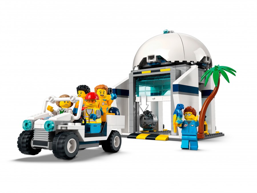 - Что в коробке? — все необходимое для создания ракеты, стартового комплекса, детальной обсерватории и центра управления полетом, а также служебный автомобиль, вездеход, дрон и шесть минифигурок.