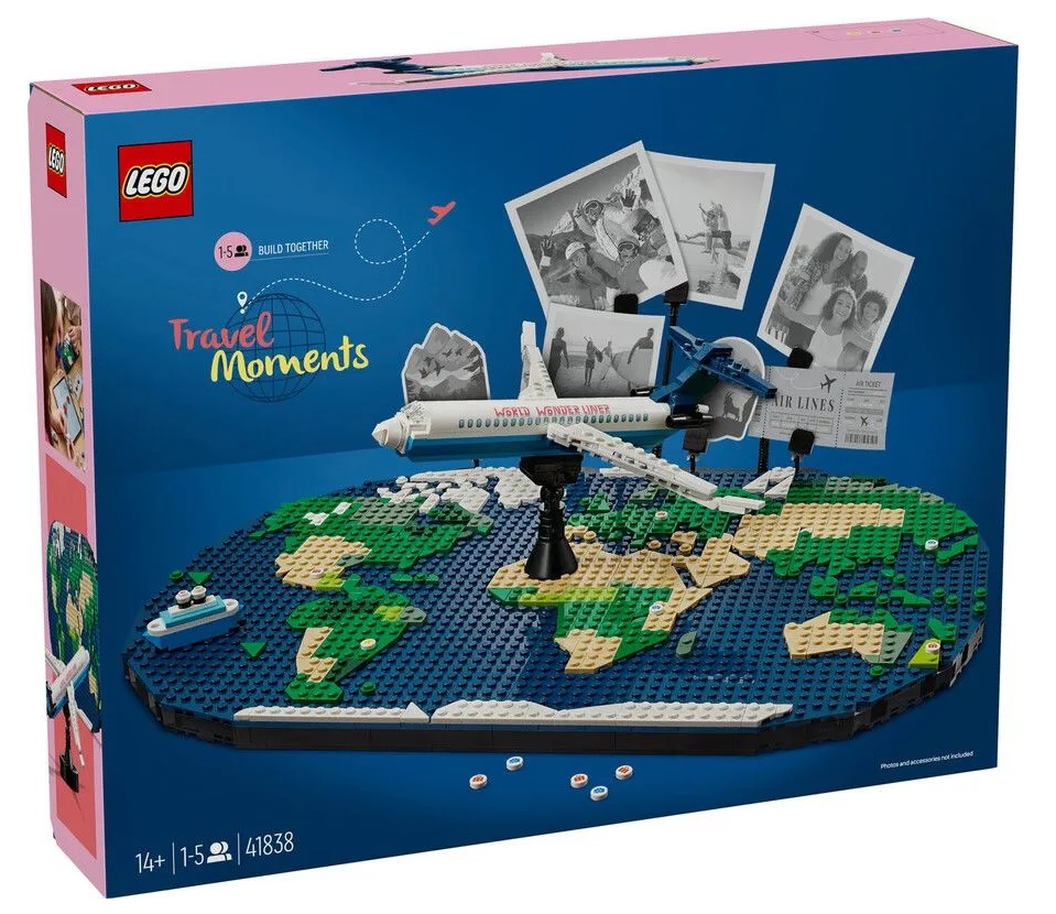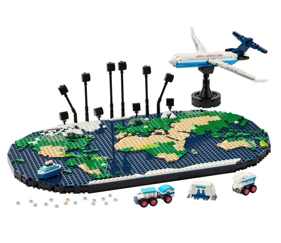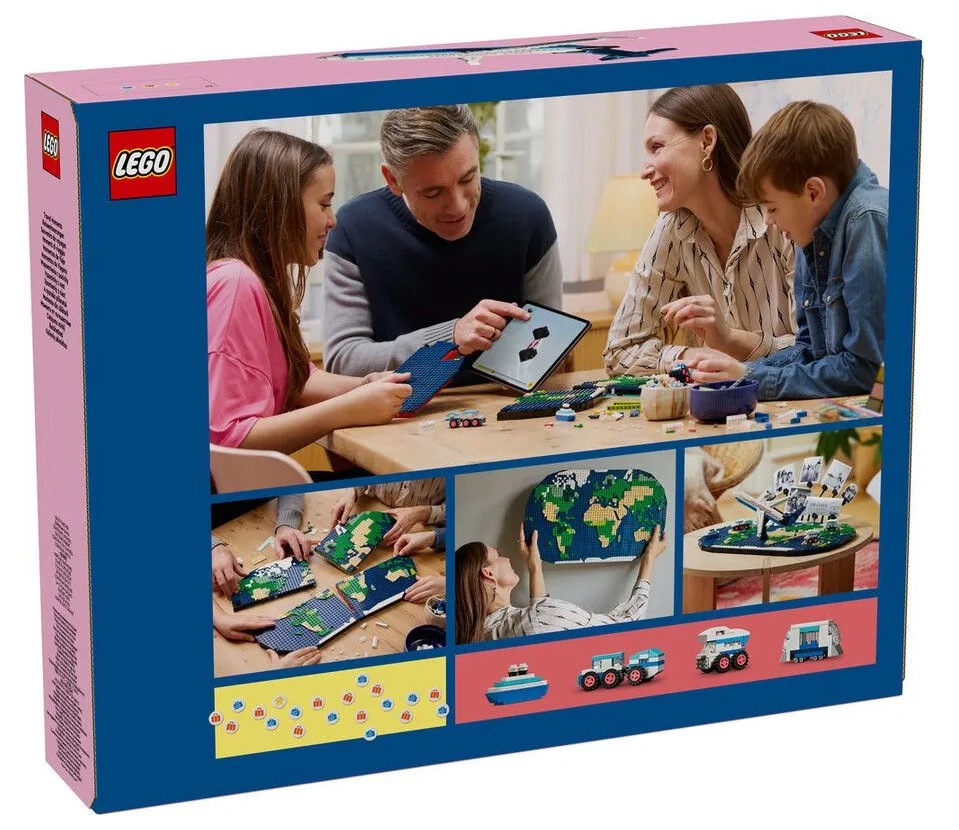 В его состав входят карта мира, которую можно собрать, реактивный самолет, 4 автомобиля для мини-сборки, 20 карточек с локациями, 10 подставок для фотографий и 5 буклетов с инструкциями по сборке.