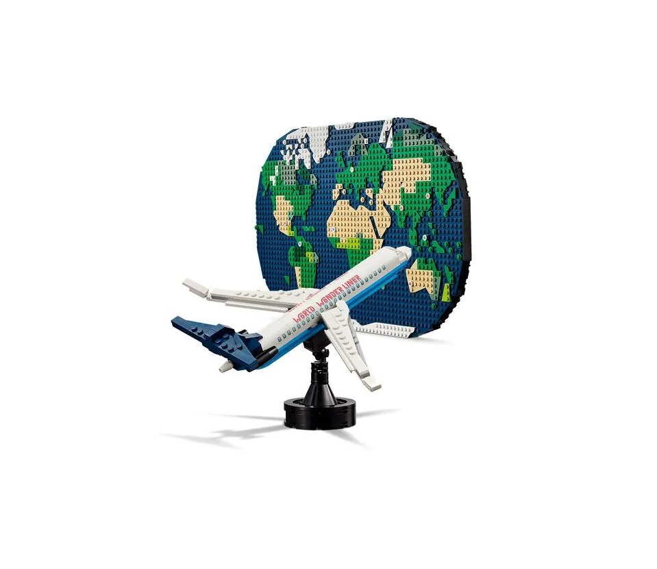 Игровой набор с картой мира, самолетом и держателем для фотографий в наборе из 1231 детали имеет размеры более 5 дюймов (14 см) в высоту, 17 дюймов (49 см) в ширину и 12 дюймов (31 см) в глубину.