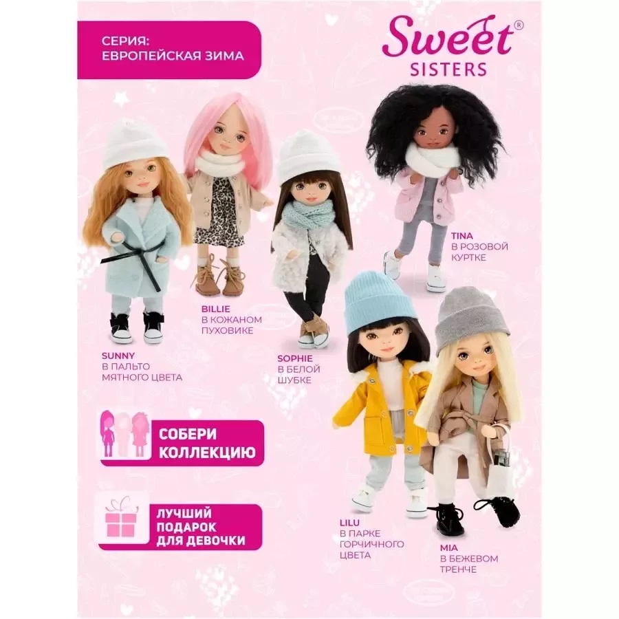 Коллекция Sweet sisters - это уникальные куклы, имеющие гибкий каркас, благодаря чему они с лёгкостью могут сидеть, стоять и даже позировать для соц.сетей! Детальная прорисовка лиц. Качественные ткани и фурнитура. Привлекательная подарочная упаковка. Дополнительные аксессуары и одежда сделают любой образ законченным и актуальным. Волосы премиального качества дают возможность делать причёски, завивать локоны и кудри или выпрямлять их горячим утюжком. Любая девочка станет стилистом и экспериментатором.