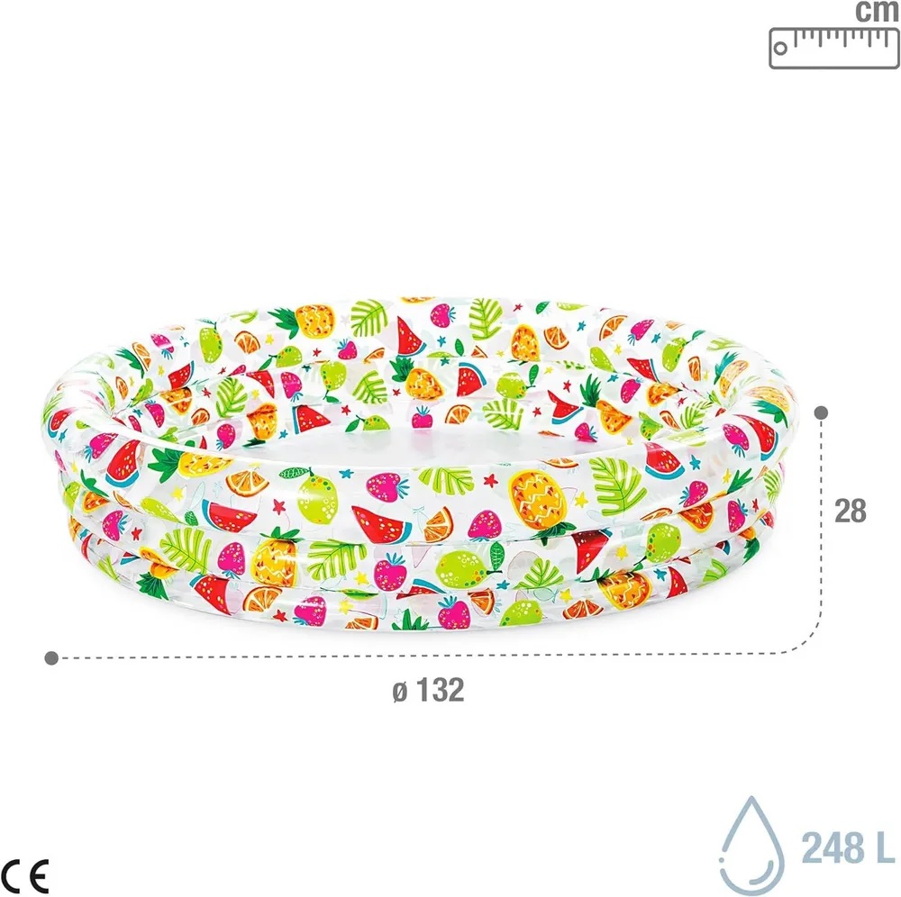 Размеры бассейна - диаметр 132 см, высота бортиков 28 см. Дно не надувное. Объем - 248 литров при наполнении на 80%.