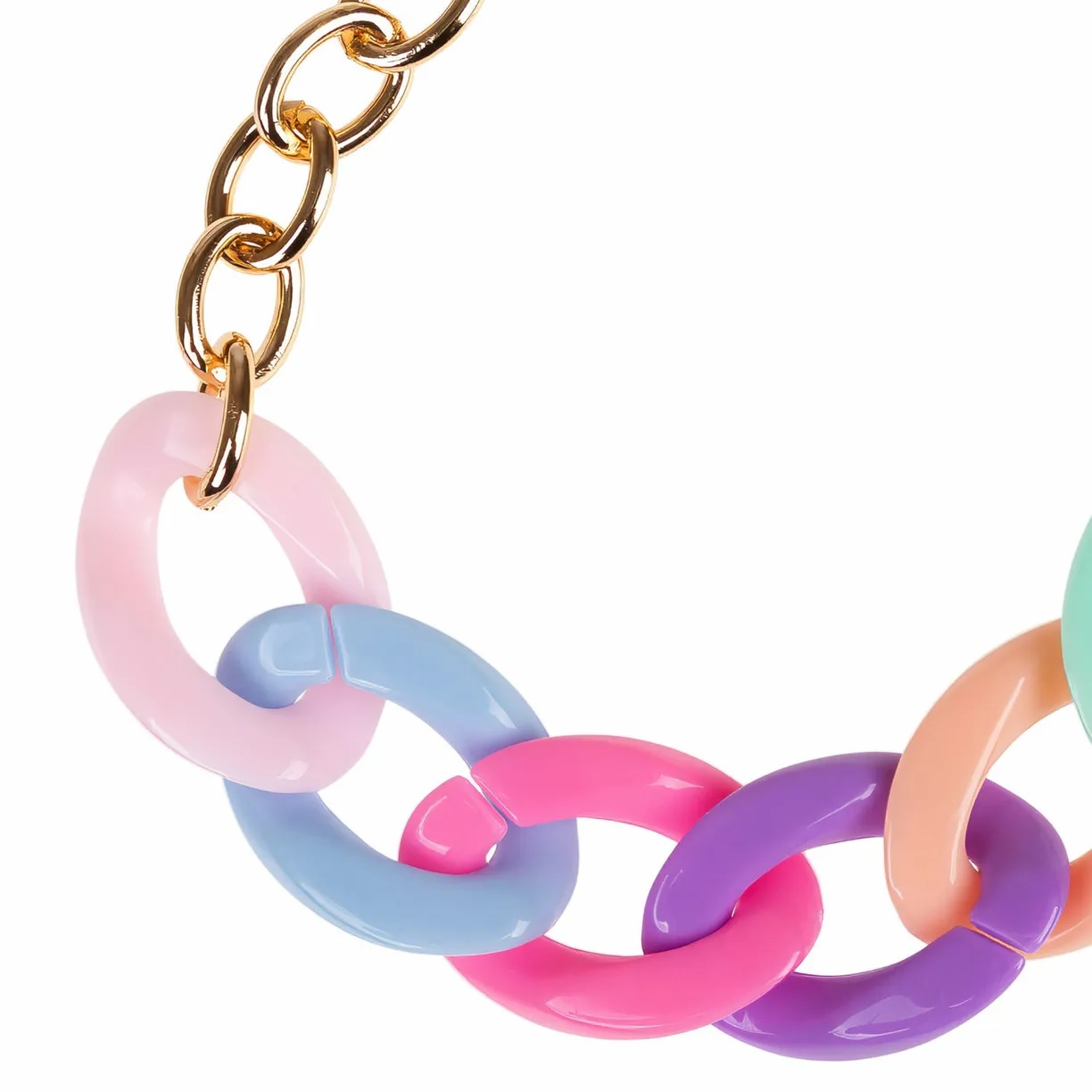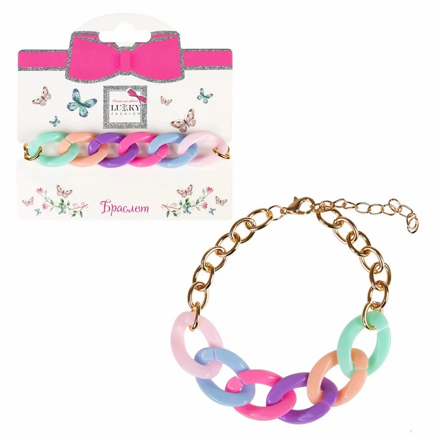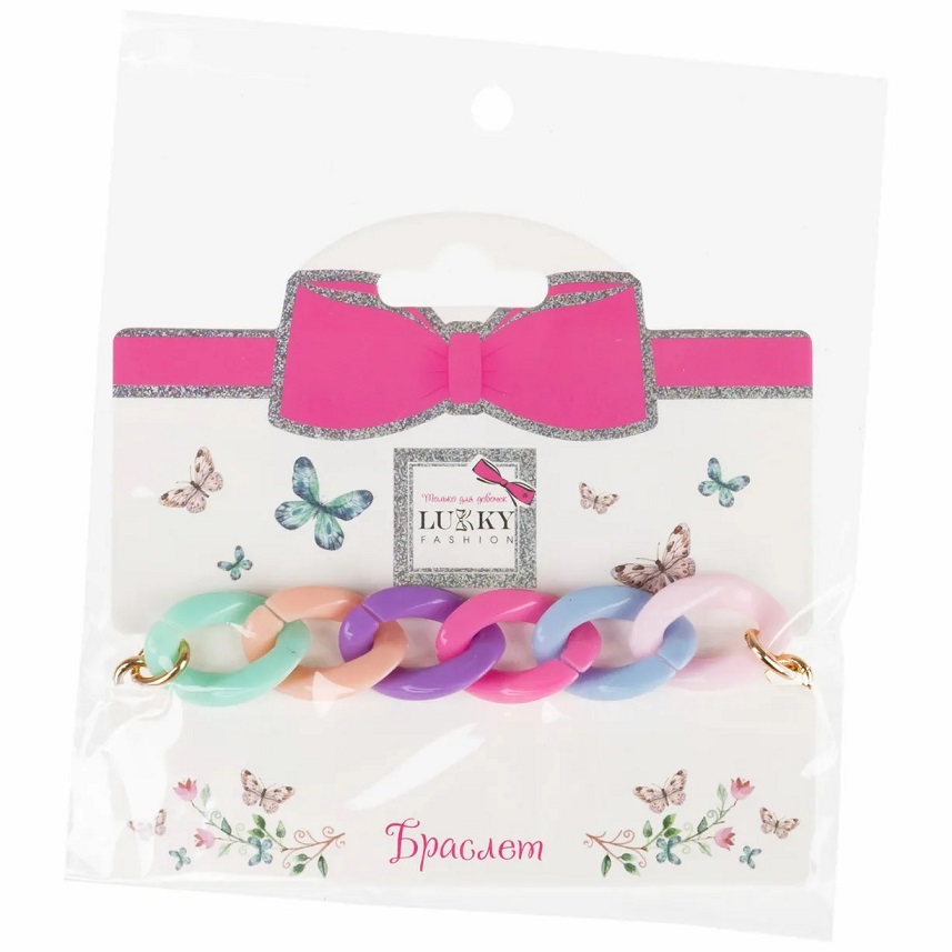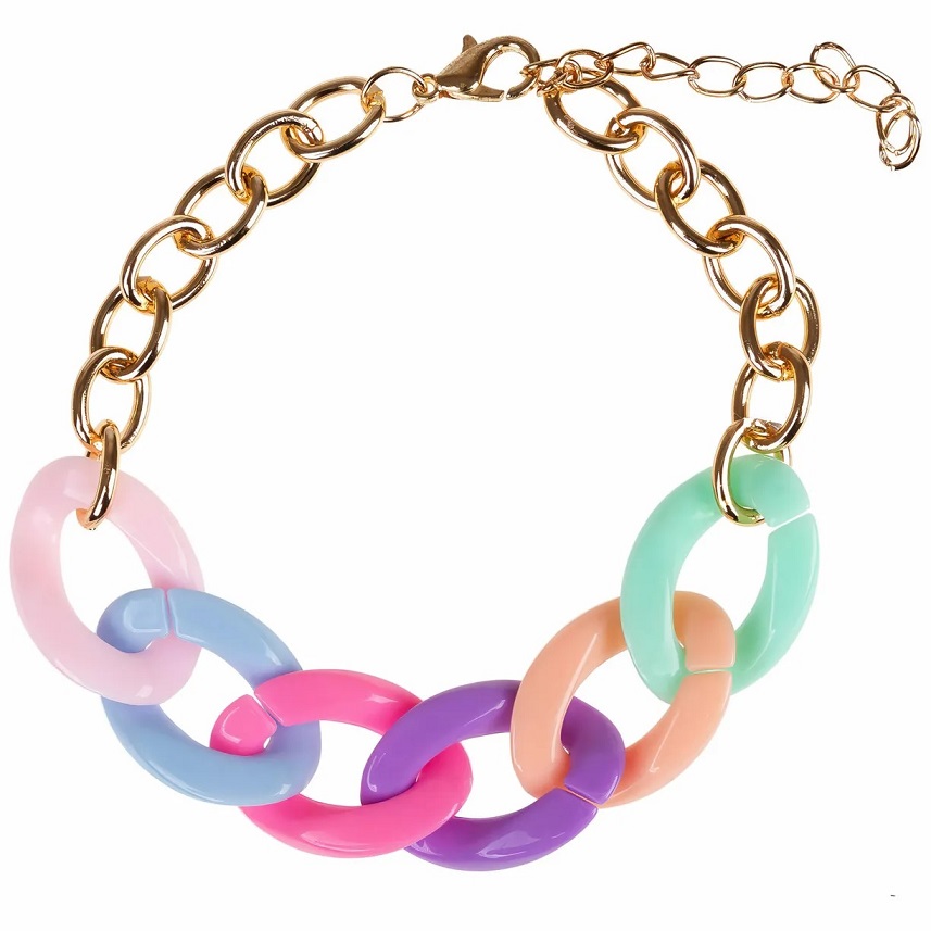 Нежный радужный браслет на руку от Lukky Fashion выполнен в виде цепочки золотого цвета и матового пластика в сочетании голубого и розового оттенков.