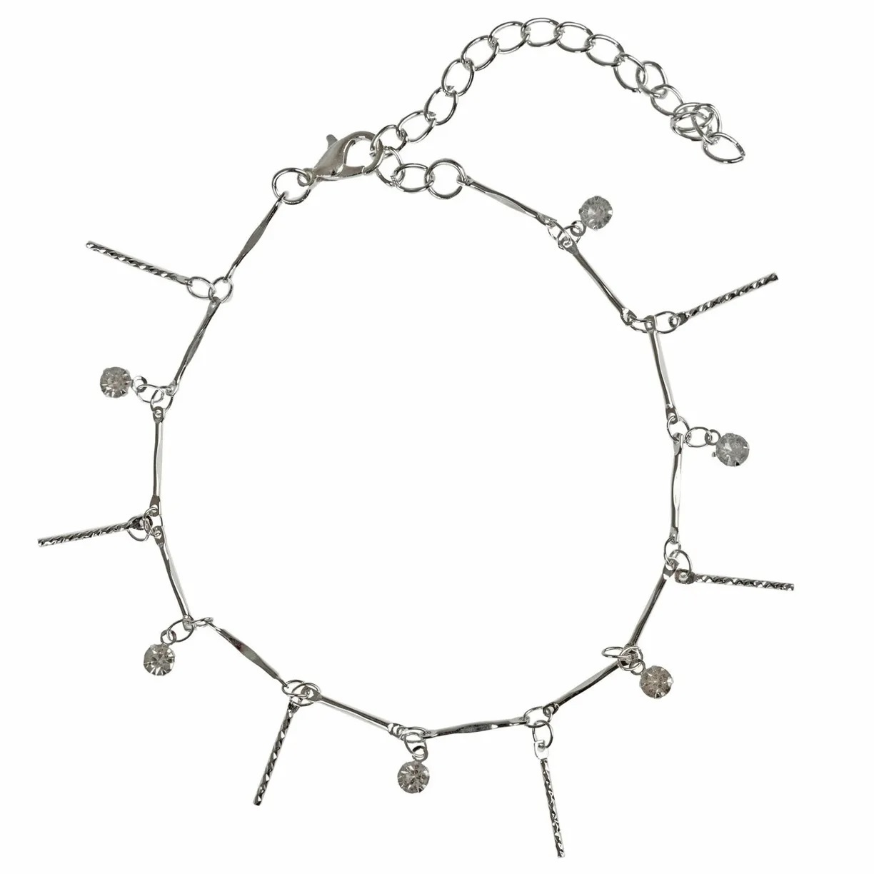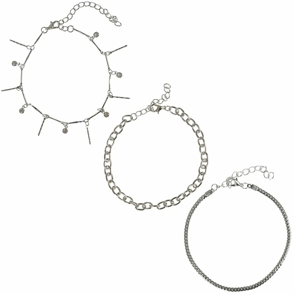 Набор из трех изысканных браслетов на руку и на ногу от Lukky Fashion сочетает различные плетения цепей серебряного цвета, один из браслетов украшен стразами.